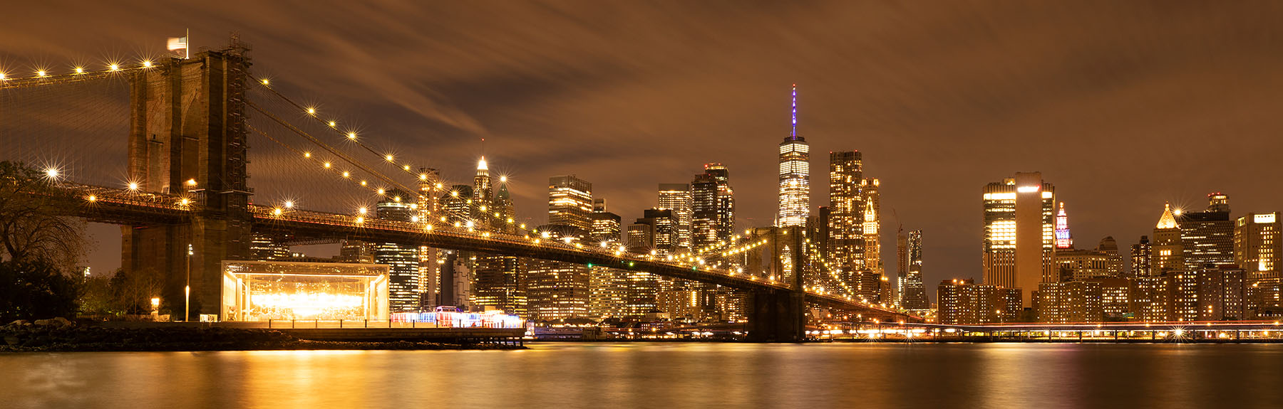 A photograph of the Brooklyn Bridge, East River, and Lower Manhattan skyline at night. The bridge itself is a suspension bridge, and at the time of opening was the longest suspension bridge in the world. With its suspension cables & famed columns, the Brooklyn Bridge is the perfect backdrop to any photo.