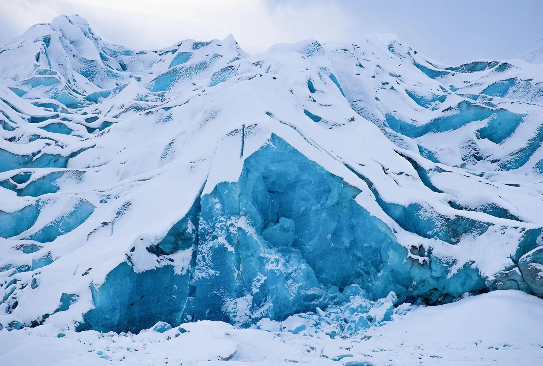 Blue is the color of pure glacier ice, compact with few air bubbles, since the air is squeezed out from the weight of the ice. Pure ice has the properties of minerals. Like sapphires, glacial ice reflects the blue colors of the light spectrum, so beautiful blue color reaches our eyes.