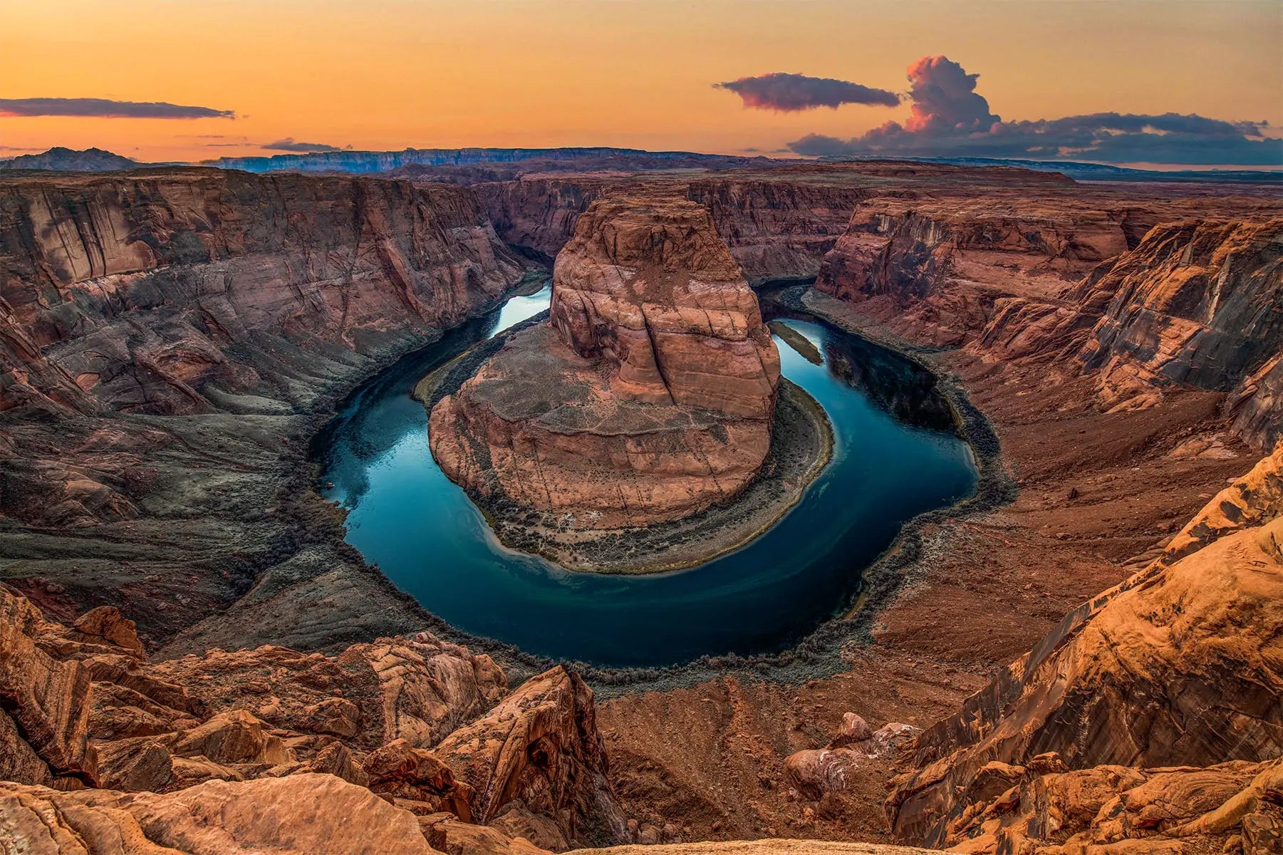The Colorado River started to cut through endless layers of rock, and when it ran into Horseshoe Bend, it creates this natural, sculptural landscape. The river eventually went around it, and now there is a 270-degree bend in the river which created the now-famous horseshoe shape. The sheer Cliff walls are made of Navajo Sandstone, a particularly dense type of sandstone. In the process of erosion, the sandstone acted as a natural barrier, forcing the water to make a sharp bend in the river thorough softer rocks.