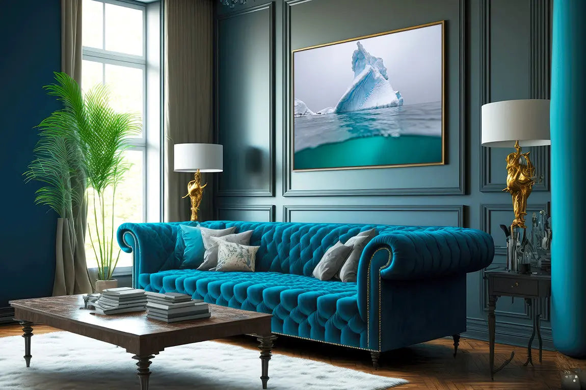 The artwork showcases the stunning blue color of the iceberg, which is characteristic of the dense ice found in glaciers. The blue hue is intensified by the natural light that filters through the water, creating a mesmerizing effect. The submerged part of the iceberg adds depth and mystery to the artwork, as it symbolizes the hidden world beneath the surface.